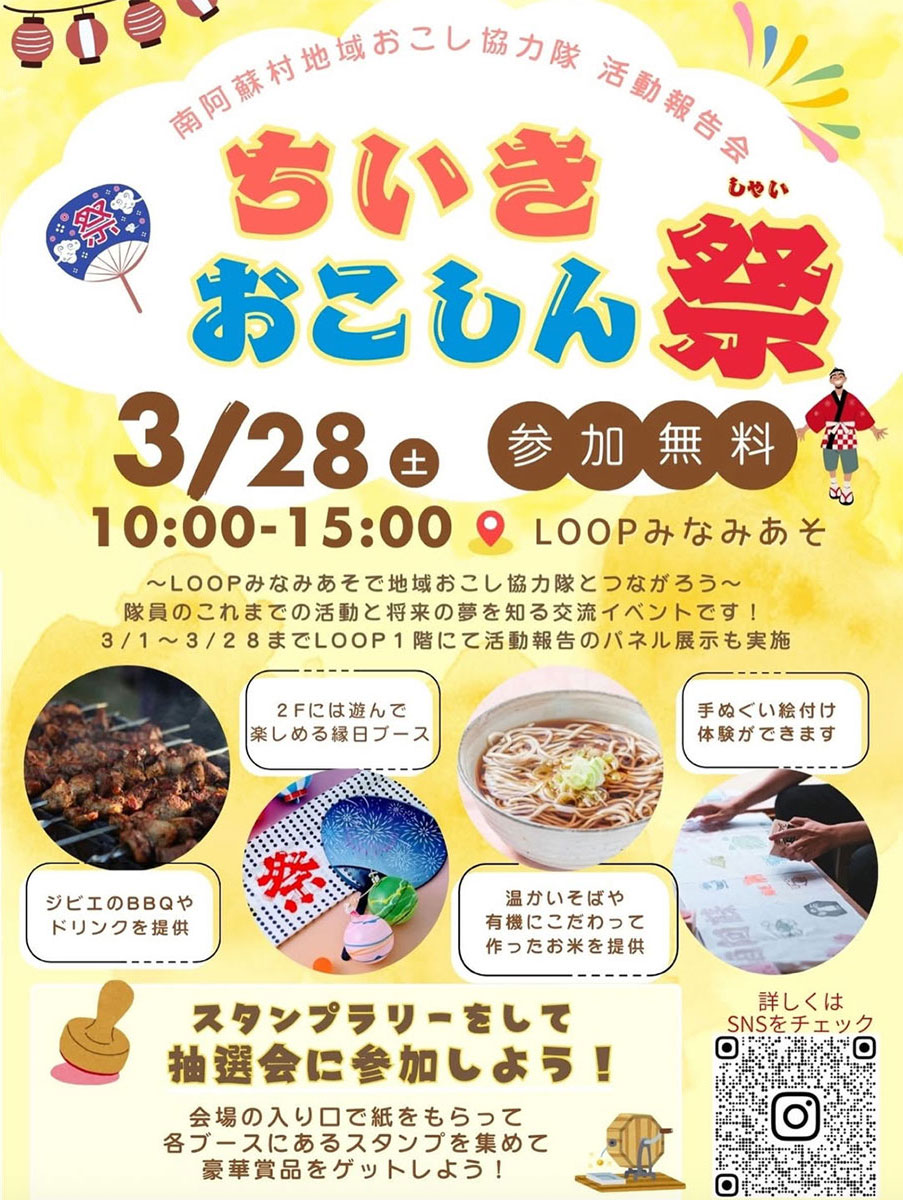 『ちいきおこしん祭』は、南阿蘇村地域おこし協力隊の活動や将来の夢について知る交流イベントとのこと。お米の食べ比べや南阿蘇産そばの振る舞いがあったり、牛輪投げ(!)や手ぬぐい作り体験などなど、美味しいと楽しいが盛りだくさんのイベントのようです。