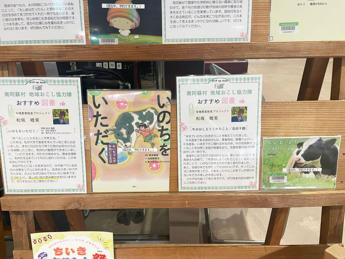 そしてもうひとつ!嬉しいことに、LOOPみなみあそ1階の図書館に、むっちゃんおすすめの書籍として、向井さんの『ヨーグルトの本』と高砂さんの『ミルクの本』とともに、『牛がおしえてくれたこと』もご紹介いただいています。展示は3月28日までですが、その後も蔵書として、たくさんの方に手に取ってもらえたら嬉しいです^^